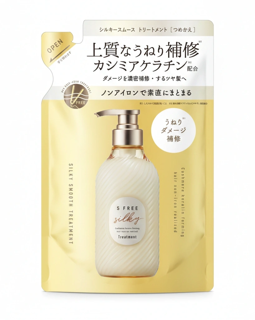 The S FREE Treatment Silky Smooth Refill is designed to deeply nourish, repair, and smooth damaged hair without the need for heat styling.